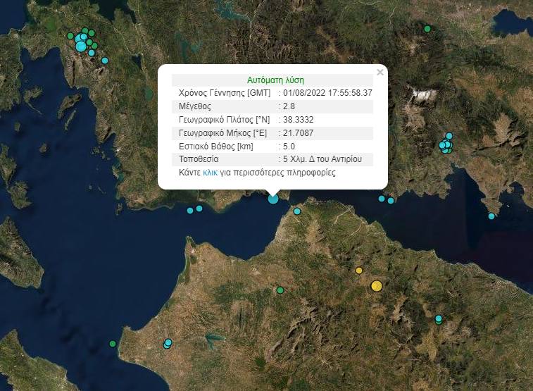 Σύμφωνα με την Αυτόματη Λύση του Γεωδυναμικού Ινστιτούτου σημειώθηκε σεισμική δόνηση 2,8 ρίχτερ με 5 χιλιόμετρα εστιακό βάθος με τοποθεσία 5 χιλιόμετρα δυτικά του Αντιρρίου.