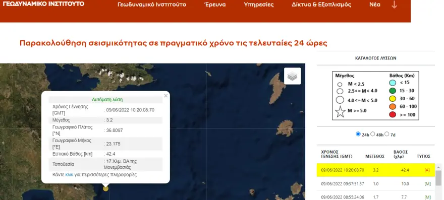 Σεισμική δόνηση 3,2 Ρίχτερ κοντά στη Μονεμβασιά (φώτο)