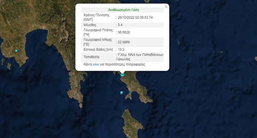Πιο συγκεκριμένα, σύμφωνα με το Γεωδυναμικό Ινστιτούτο Αθηνών, η σεισμική δόνηση σημειώθηκε στις 05:35, επτά χιλιόμετρα νοτιοανατολικά των Παπαδιάνικων Λακωνίας.