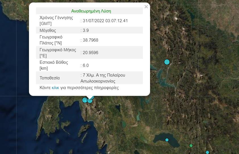 Στις 06:08 το πρωί της Κυριακής 31 Ιουλίου, σημειώθηκε σεισμική δόνηση μεγέθους 3,9 βαθμών της κλίμακας Ρίχτερ στην Αιτωλοακαρνανία.