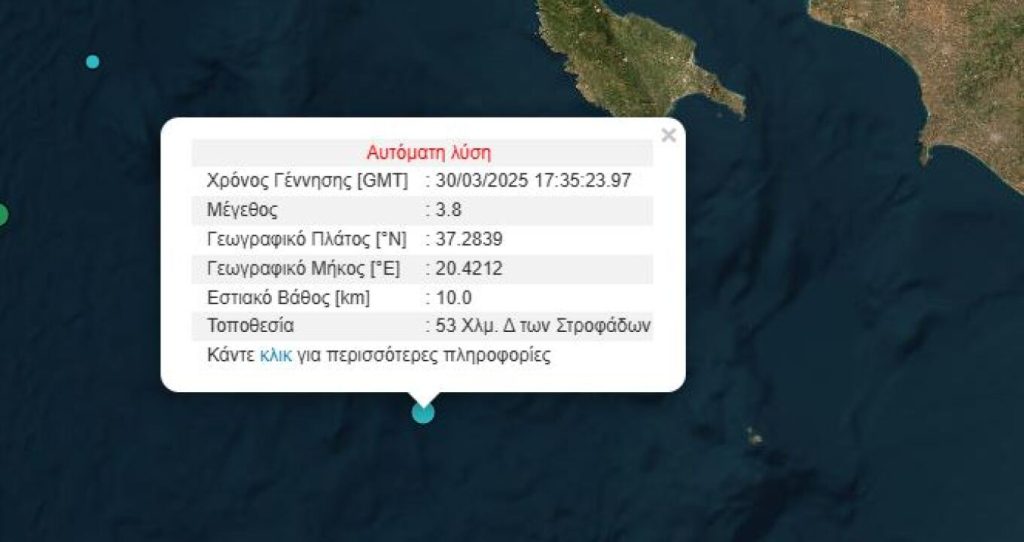 Όπως διακρίνει κανείς στην παραπάνω φωτογραφία, το επίκεντρο του σεισμού έγινε στις 19:37 και εντοπίζεται 53 χιλιόμετρα δυτικά των Στροφάδων, με εστιακό βάθος 10 χιλιόμετρα.
