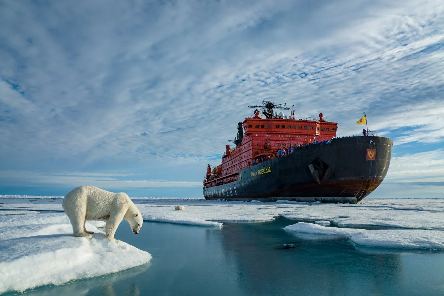 Πολική αρκούδα στη Θάλασσα του Κάρα, στις βόρειες ακτές της Σιβηρίας, γοητεύεται από το ρωσικό πυρηνοκίνητο παγοθραυστικό “Sibir” που «λιώνει» τον πάγο ανάμεσά τους.
