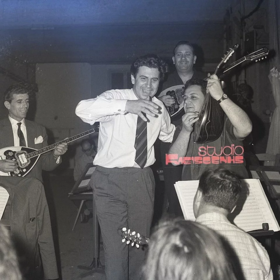 «Ο Κλεισθένης φωτογραφίζει τον Μπιθικώτση τον Θεοδωράκη τον Ζαμπέτα και τον Χατζιδακι στην Μαγική Πόλη στο Θεατρο Παρκ το 1963. Αδημοσίευτη φωτογραφία», αναφέρεται στη λεζάντα της φωτογραφίας.