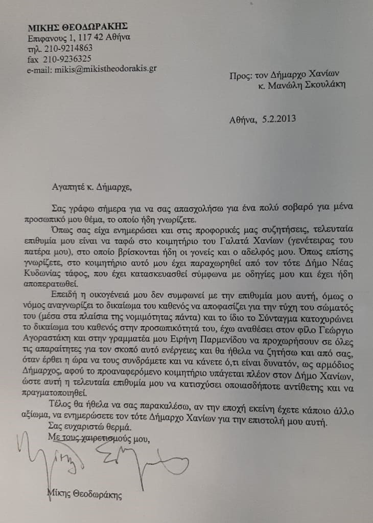 Μάλιστα, ο Δήμαρχος Χανίων Παναγιώτης Σημανδηράκης την επιστολή που είχε στείλει το 2013 ο Μίκης Θεοδωράκης στον τότε Δήμαρχο Μανώλης Σκουλάκη, με μοναδικό περιεχόμενο τη συνδρομή του ώστε να υλοποιηθεί η επιθυμία του να ταφεί στο κοιμητήριο του Γαλατά, εκεί δηλαδή που αναπαύονται οι γονείς και ο αδερφός του.