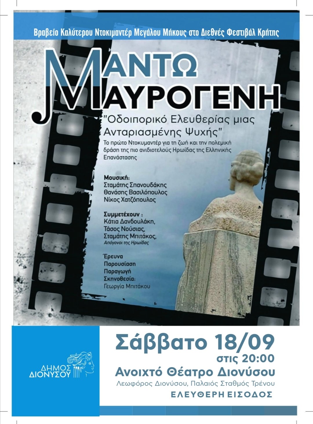 Το βραβευμένο στο Διεθνές Φεστιβάλ Κινηματογράφου Κρήτης, με βραβείο Επιτροπής και το διαδικτυακό Βραβείο Κοινού, Ντοκιμαντέρ της Γεωργίας Μπιτάκου “Μαντώ Μαυρογένη Οδοιπορικό Ελευθερίας μιας Ανταριασμένης Ψυχής”, θα προβληθεί στο Θέατρο Διονύσου στον παλαιό σταθμό τρένου.