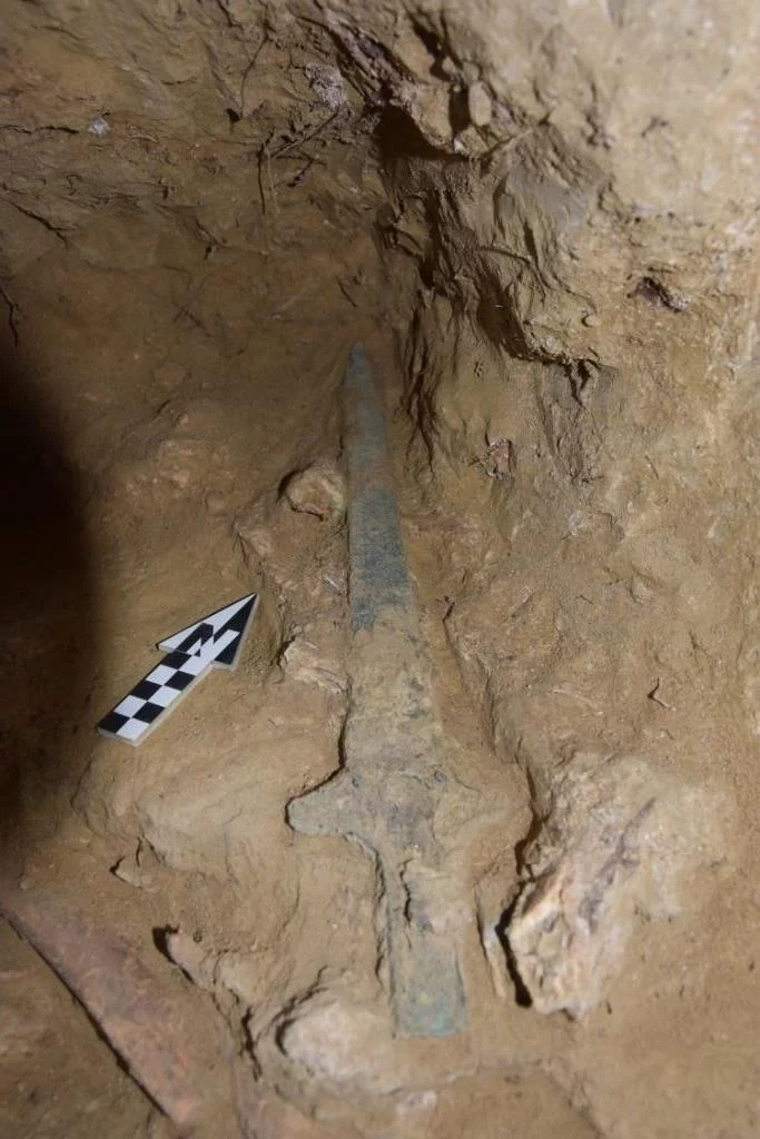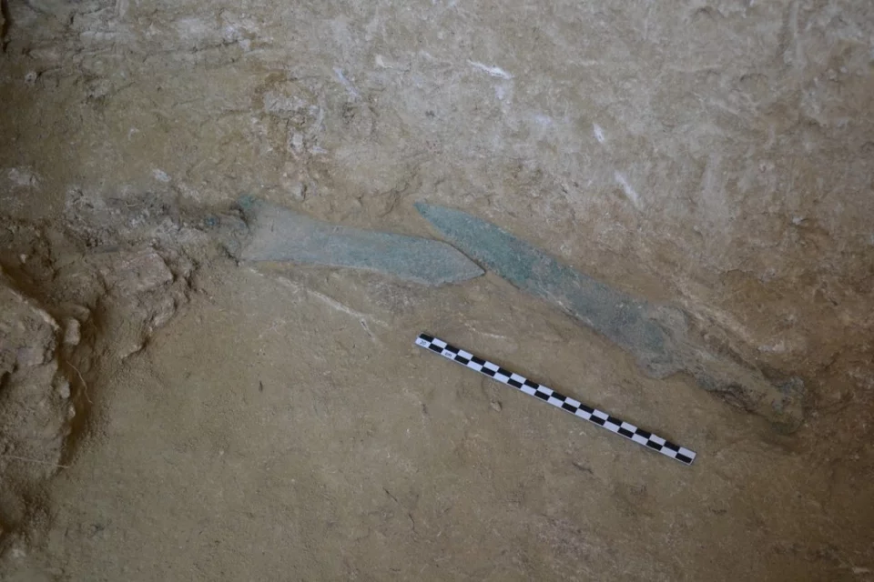 Μεταξύ των οστών και των κτερισμάτων που συνόδευαν αυτές τις παλαιότερες ταφές, χάντρες από γυαλί και κορναλίνη, πήλινο ειδώλιο αλόγου, είχε τοποθετηθεί και ένα εξαιρετικής διατήρησης χάλκινο ξίφος. Στη βάση του σωρού των οστών, βρέθηκαν, επίσης, τοποθετημένα δύο ακόμη ακέραια χάλκινα ξίφη, τα οποία σώζουν και μέρος των ξύλινων λαβών τους.