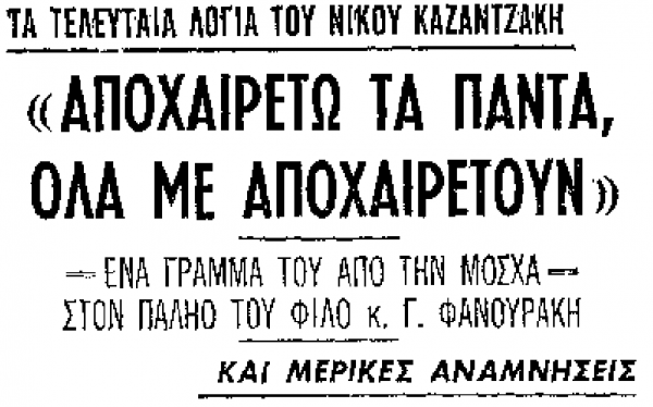 Στις 20 Ιουνίου του 1957, λίγου μήνες πριν τον θάνατό του, ο σπουδαίος λογοτέχνης έγραφε, από τη Μόσχα, στον φίλο του Γεώργιο Φανουράκη: