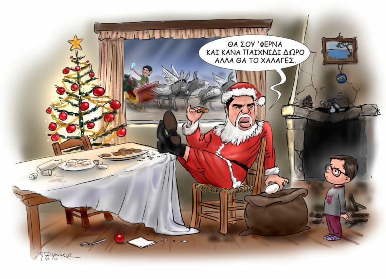 Σε χριστουγεννιάτικο κλίμα, ο σκιτσογράφος τοποθετεί τον Άγιο Βασίλη στο σπίτι ενός μικρού παιδιού, μόνο που ο αγαπημένος Άγιος έχει τη μορφή του Αλέξη Τσίπρα και αυτή τη φορά δεν έφερε κανένα δώρο.