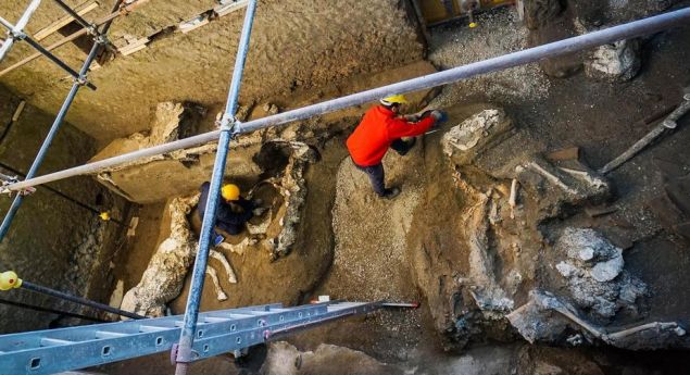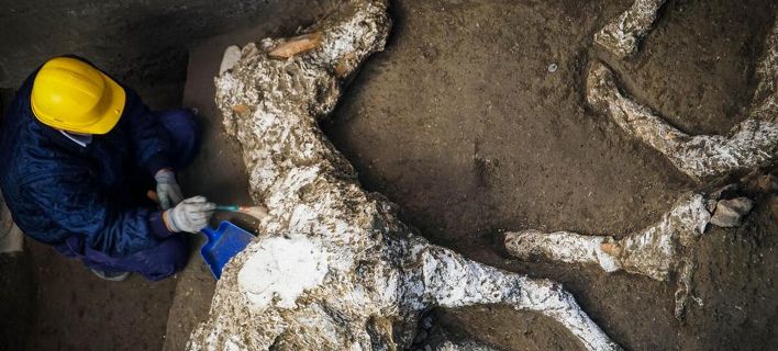Ένα ακόμη σπάνιο εύρημα έφερε στο φως η αρχαιολογική σκαπάνη στην Πομπηία: ένα ατόφιο απολιθωμένο άλογο με χαλινάρι και σέλα που βρέθηκε στον στάβλο μιας έπαυλης.
