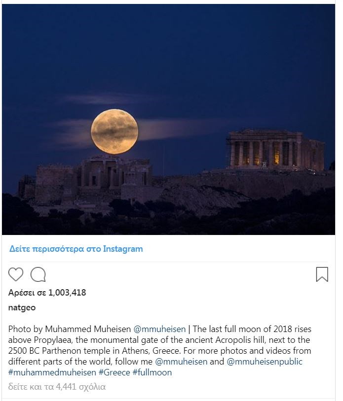 Την τελευταία πανσέληνο του 2018, δίπλα στον Παρθενώνα, διάλεξε να ποστάρει το National Geographic, αποχαιρετώντας το χρόνο.
