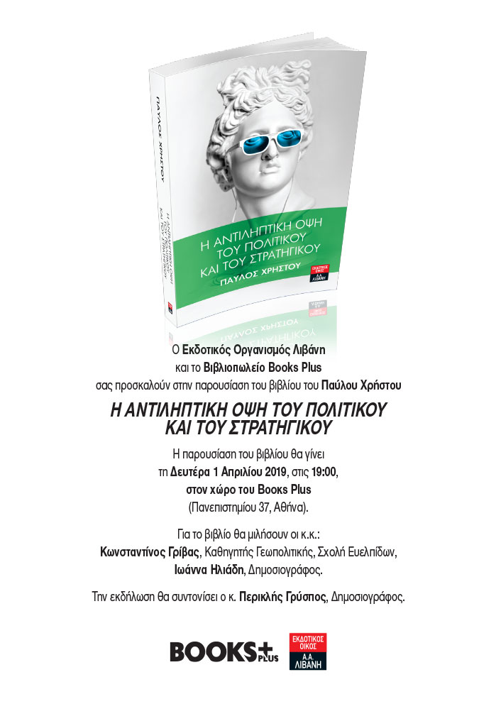Ο Εκδοτικός Οργανισµός Λιβάνη και το Βιβλιοπωλείο Books Plus σας προσκαλούν στην παρουσίαση του βιβλίου του Παύλου Χρήστου, «Η ΑΝΤΙΛΗΠΤΙΚΗ ΟΨΗ ΤΟΥ ΠΟΛΙΤΙΚΟΥ ΚΑΙ ΤΟΥ ΣΤΡΑΤΗΓΙΚΟΥ».