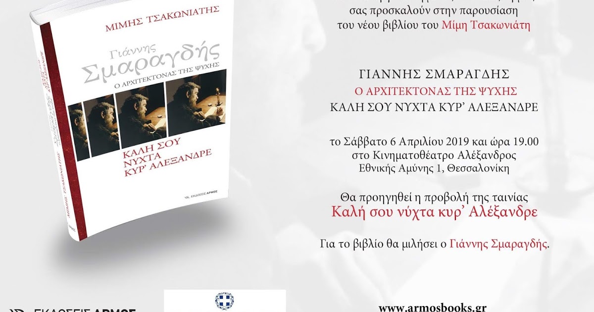 Το Σάββατο 6/4/2019 ώρα 19.00 στον κινηματογράφο Αλέξανδρος στη Θεσσαλονίκη το βιβλίο «Γιάννης Σμαραγδής: Ο Αρχιτέκτονας της Ψυχής – Καλή σου νύχτα, κυρ Αλέξανδρε» του Μίμη Τσακωνιάτη.