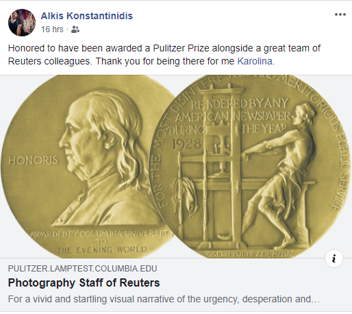 «Ηταν τιμή μου να βραβευτώ με το Πούλιτζερ μαζί με τους συναδέλφους μου από το Reuters. Σε ευχαριστώ Καρολίνα που ήσουν εκεί για μένα», ανέφερε ο Αλκης Κωνσταντινίδης.