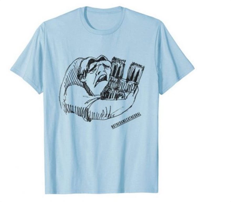 Τα μακό μπλουζάκια που απεικονίζουν τον διάσημο ήρωα του Βίκτωρ Ουγκώ Κουασιμόδο να θρηνεί το μνημείο της γαλλικής πρωτεύουσας κάνουν θραύση, όπως σχολιάζει το σχετικό δημοσίευμα.
