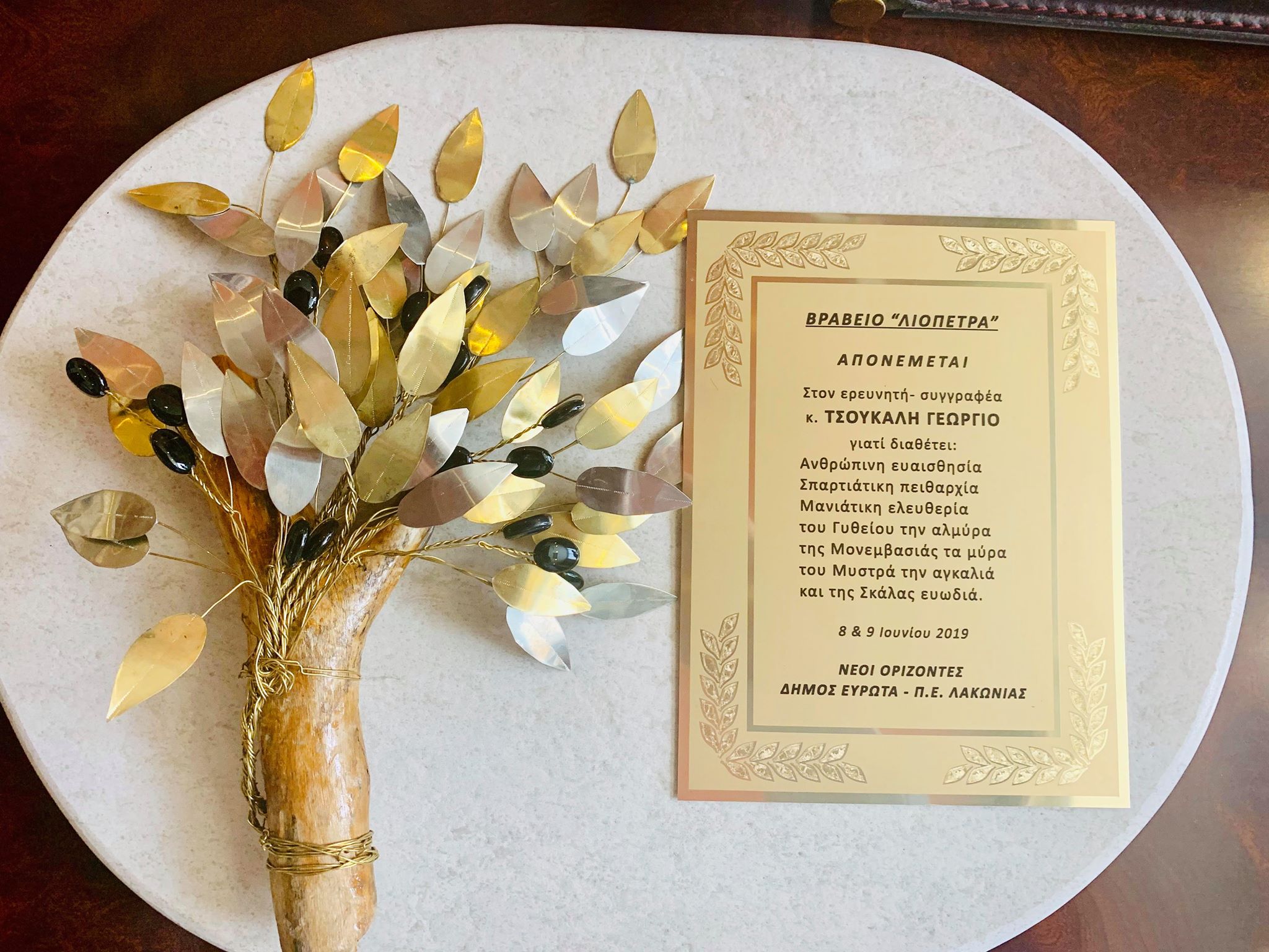 «Ευχαριστώ το σύλλογο Νέοι Ορίζοντες για τη βράβευση της ταπεινότητος μου με το βραβείο Λιόπετρα. Συνεχίζω τον αγώνα ενάντια στην αρχαιοκαπηλία αισθανόμενος ότι ο πήχης καθημερινά ψηλώνει».