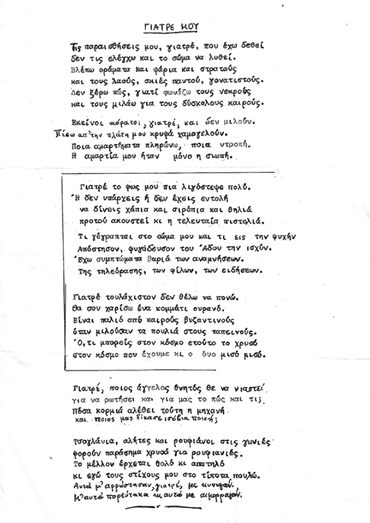 Ωστόσο, εκείνο που προκαλεί εντύπωση είναι μια άλλη ανάρτηση, που είχε κάνει προ μερικών εβδομάδων ο τραγουδιστής, στον λογαριασμό του στο Facebook. Ο Λαυρέντης Μαχαιρίτσας, τότε είχε ανεβάσει τους στίχους ενός κειμένου του Μάνου Ελευθερίου, με τίτλο «Γιατρέ μου». Οι στίχοι του Μ. Ελευθερίου συνταράσσουν, ενώ ομολογούν και τη μελαγχολία του καλλιτέχνη, ενδεχομένως αποτέλεσμα των δειγμάτων κατάθλιψης, με την οποία πάλευε ο αγαπημένος τραγουδιστής για χρόνια.