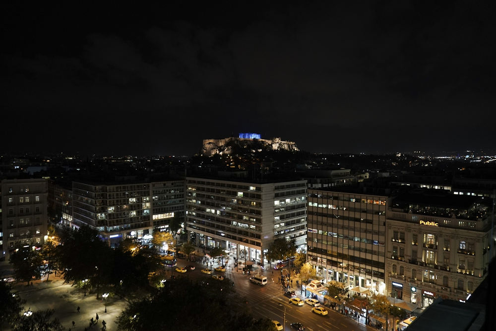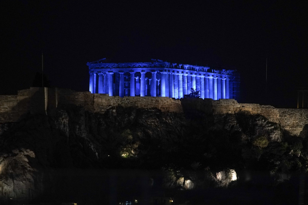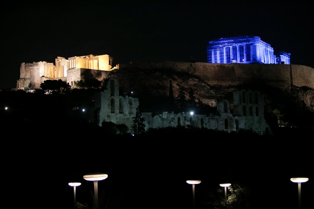 Εντυπωσιακές οι εικόνες της Ακρόπολης, το βράδυ της Τετάρτης, όταν και ο Παρθενώνας άλλαξε χρώμα και ντύθηκε στα μπλε.