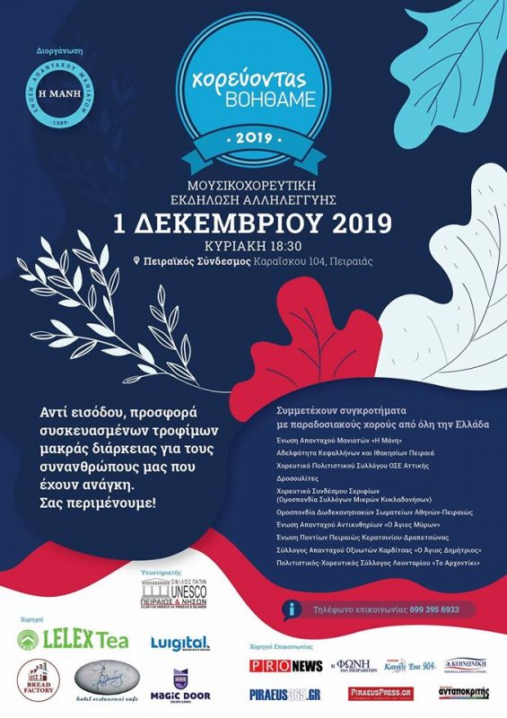 Η Ένωση Απανταχού Μανιατών έχει την χαρά να σας προσκαλέσει την Κυριακή 1/12 στη μεγάλη φιλανθρωπική, μουσικοχορευτική εκδήλωση «Χορεύοντας βοηθάμε» στις 18:30 στον Πειραϊκό Σύνδεσμο (Καραίσκου 104, Πειραιάς).