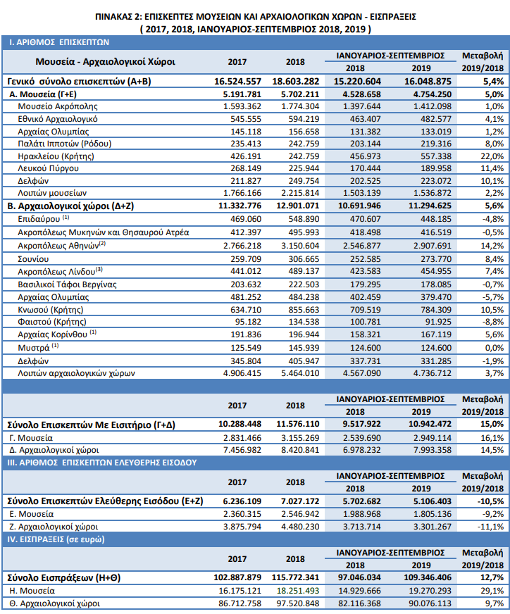 Σύμφωνα επίσης με την ΕΛΣΤΑΤ, στους αρχαιολογικούς χώρους σημειώθηκε τον Σεπτέμβριο 2019 αύξηση των επισκεπτών κατά 12,3%, ενώ ο αριθμός των επισκεπτών ελεύθερης εισόδου παρουσίασε αύξηση 20,1% και οι εισπράξεις αυξήθηκαν 10,2%.