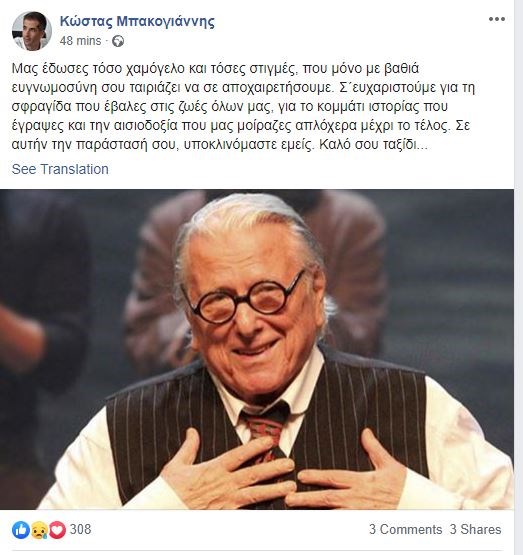 “Μας έδωσες τόσο χαμόγελο και τόσες στιγμές, που μόνο με βαθιά ευγνωμοσύνη σου ταιριάζει να σε αποχαιρετήσουμε. Σ´ευχαριστούμε για τη σφραγίδα που έβαλες στις ζωές όλων μας, για το κομμάτι ιστορίας που έγραψες και την αισιοδοξία που μας μοίραζες απλόχερα μέχρι το τέλος. Σε αυτήν την παράστασή σου, υποκλινόμαστε εμείς. Καλό σου ταξίδι…”.