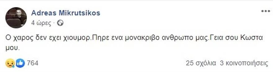 Το μήνυμα του παρουσιαστή, ο οποίος ζει ακόμη το δικό του πένθος αφού πριν λίγο διάστημα έφυγε από τη ζωή ο αδερφός του, Θάνος Μικρούτσικος, είναι συγκινητικό. «Ο χάρος δεν έχει χιούμορ. Πήρε ένα μονάκριβο άνθρωπο μας. Γεια σου Κώστα μου» έγραψε ο Αντρέας Μικρούτσικος αποχαιρετώντας με αυτόν τον τρόπο τον αγαπημένο ηθοποιό.