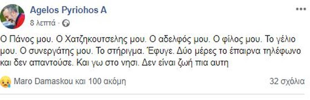 «Ο Πάνος μου. Ο Χατζηκουτσελης μου. Ο αδελφός μου. Ο φίλος μου. Το γέλιο μου. Ο συνεργάτης μου. Το στήριγμα. Έφυγε. Δύο μέρες το έπαιρνα τηλέφωνο και δεν απαντούσε. Και γω στο νησί. Δεν είναι ζωή πια αυτή».