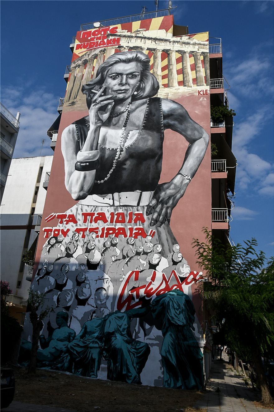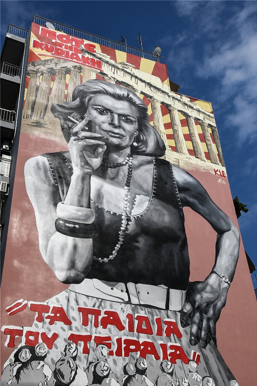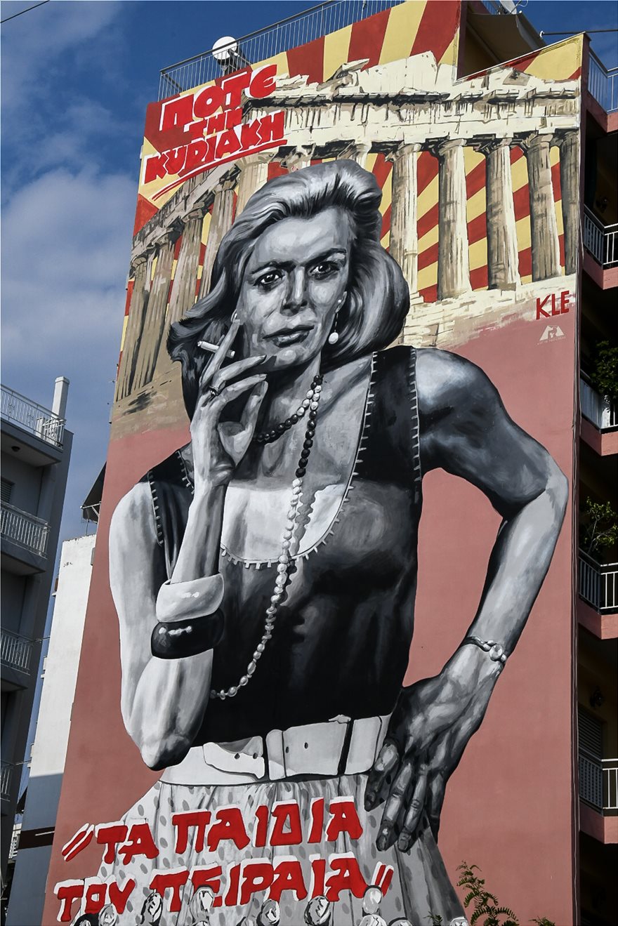 Στην εντυπωσιακή δημιουργία απεικονίζεται η Μελίνα Μερκούρη με φόντο τον Παρθενώνα ενώ η εικόνα συμπληρώνεται από τον τίτλο της εμβληματικής ταινίας με πρωταγωνίστρια την Μελίνα «Ποτέ την Κυριακή» και το τραγούδι «Τα παιδιά του Πειραιά».