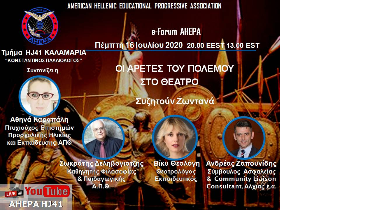 Διαδικτυακή συζήτηση με την επικοινωνιακή χορηγία του pronews.gr διοργανώνει η Αmerican Hellenic Educational Progressive Association- AHEPA σε συνεργασία με Mediterranean Council & Forum MEDCF (medcf.org), την Πέμπτη 16 Ιουλίου 20.00 και με θέμα « OI ΑΡΕΤΕΣ ΤΟΥ ΠΟΛΕΜΟΥ ΣΤΟ ΘΕΑΤΡΟ», συζητούν ζωντανά, Σωκράτης Δεληβογιατζής Καθηγητής Φιλοσοφίας και Παιδαγωγικής ΑΠΘ, η κ. Βίκυ Θεολόγη Θεατρoλόγος- Εκπαιδευτικός,θα συντονίσει η κ. Αθηνά Καραπάλη Πτυχιούχος Επιστημών Προσχολικής ηλικίας και εκπαίδευσης, θα προλογίσει και θα σχολιάσει ο Ανδρέας Ζαπουνίδης Σύμβουλος Ασφαλείας & Community Liaison Consultant Energy and Defence Industry – Πρόεδρος του τμήματος ΑΗΕΡΑ HJ41 Καλαμαριάς.