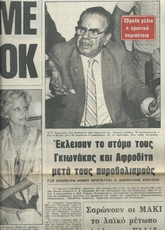 Ο ηθοποιός συνελλήφθη και το πρωινό της επόμενης ημέρας τον βρήκε κρατούμενο προκειμένου να απολογηθεί στον ανακριτή για απόπειρα ανθρωποκτονίας. Το “πανηγύρι” που στήθηκε στις εφημερίδες της εποχής, δεν είχε προηγούμενο, με τον Γιάννη Γκιωνάκη να ισχυρίζεται ότι λάτρευε τη σύντροφο του και σε καμία περίπτωση δεν είχε πρόθεση να τη σκοτώσει.