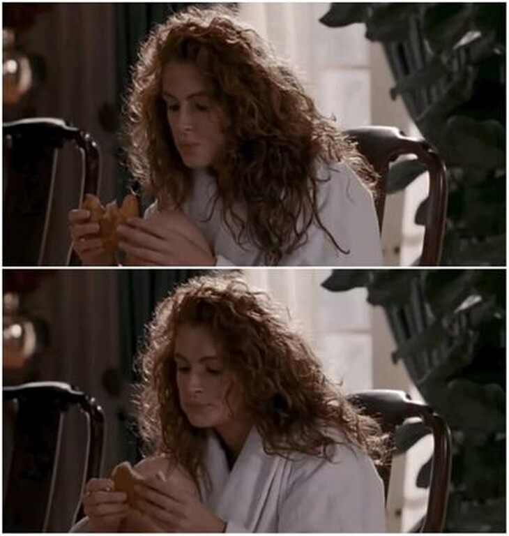 Στην ίδια σκηνή βλέπουμε την Julia Roberts να τρώει κρουασάν και τηγανίτα.
