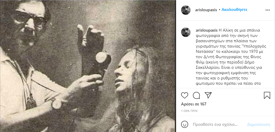 Ειδικότερα, απεικονίζεται η Αλίκη σε μια σπάνια φωτογραφία από την σκηνή των βασανιστηρίων στο πλαίσιο των γυρισμάτων της ταινίας “Υπολοχαγός Νατάσσα” το καλοκαίρι του 1970 με τον Δ/ντή Φωτογραφίας της Φίνος Φιλμ (εκείνη την περίοδο) Δήμο Σακελλαρίου.