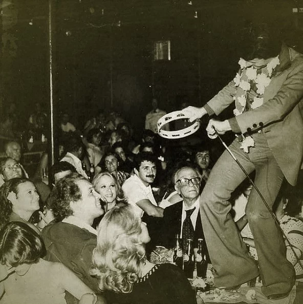Στην φωτογραφία βλέπουμε τον Γιάννη Φλωρινιώτη στην πίστα, με τη Τζένη Καρέζη, τον Κώστα Καζάκο και την Αλίκη Βουγιουκλάκη να διασκεδάζουν με τα τραγούδια του.