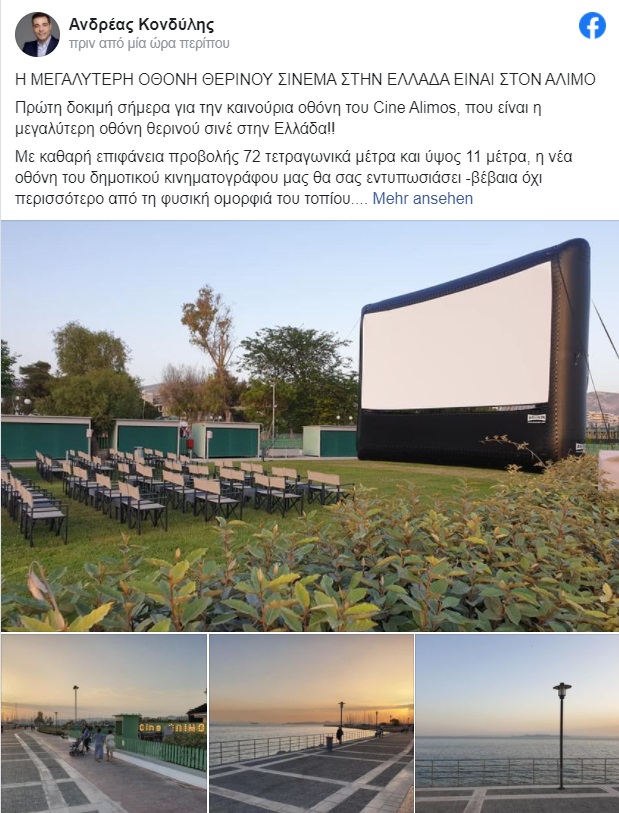 «Η μεγαλύτερη οθόνη θερινού σινεμά στην Ελλάδα είναι στον Άλιμο. Πρώτη δοκιμή σήμερα για την καινούρια οθόνη του Cine Alimos, που είναι η μεγαλύτερη οθόνη θερινού σινέ στην Ελλάδα!!