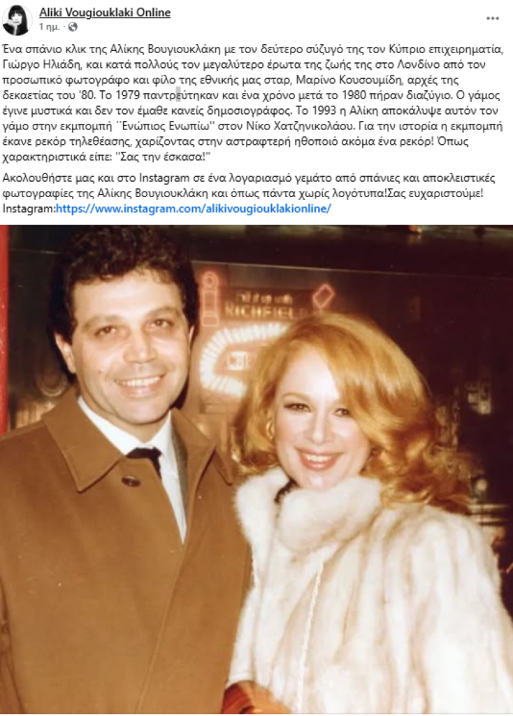 «Ένα σπάνιο κλικ της Αλίκης Βουγιουκλάκη με τον δεύτερο σύζυγό της τον Κύπριο επιχειρηματία, Γιώργο Ηλιάδη, και κατά πολλούς τον μεγαλύτερο έρωτα της ζωής της στο Λονδίνο από τον προσωπικό φωτογράφο και φίλο της εθνικής μας σταρ, Μαρίνο Κουσουμίδη, αρχές της δεκαετίας του ’80.