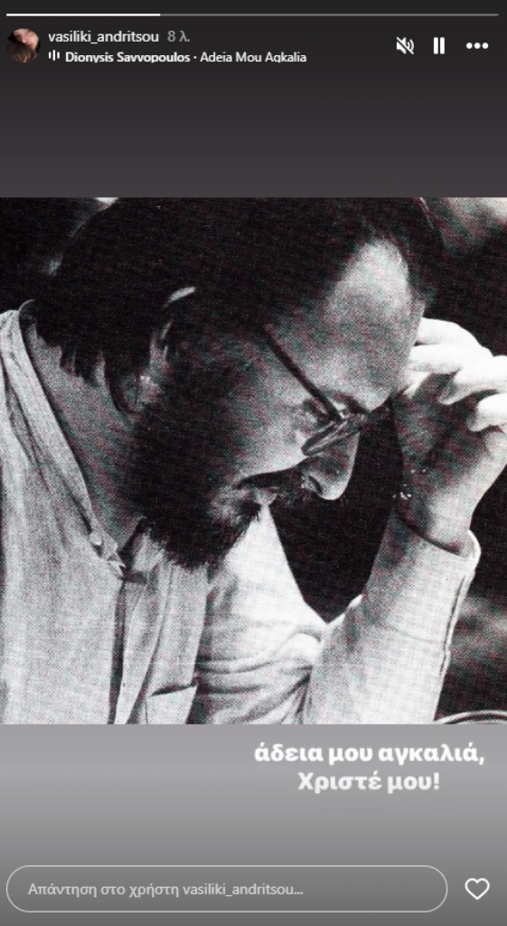 Η Βασιλική Ανδρίτσου με τη σειρά της, ανάρτησε κι εκείνη ένα στιγμιότυπο του Διονύση Σαββόπουλου και πάνω σε αυτό έγραψε στίχο ενός από τα διασημότερα τραγούδια του.
