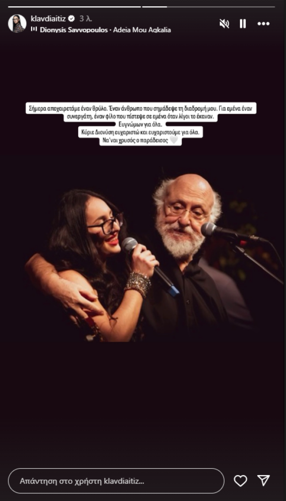 Αν και πολύ νεότερη, η Κλαυδία ήταν κι εκείνη ανάμεσα σε αυτούς που μεγάλωσαν με τραγούδια του και είχαν την τύχη να συνεργαστούν μαζί του.