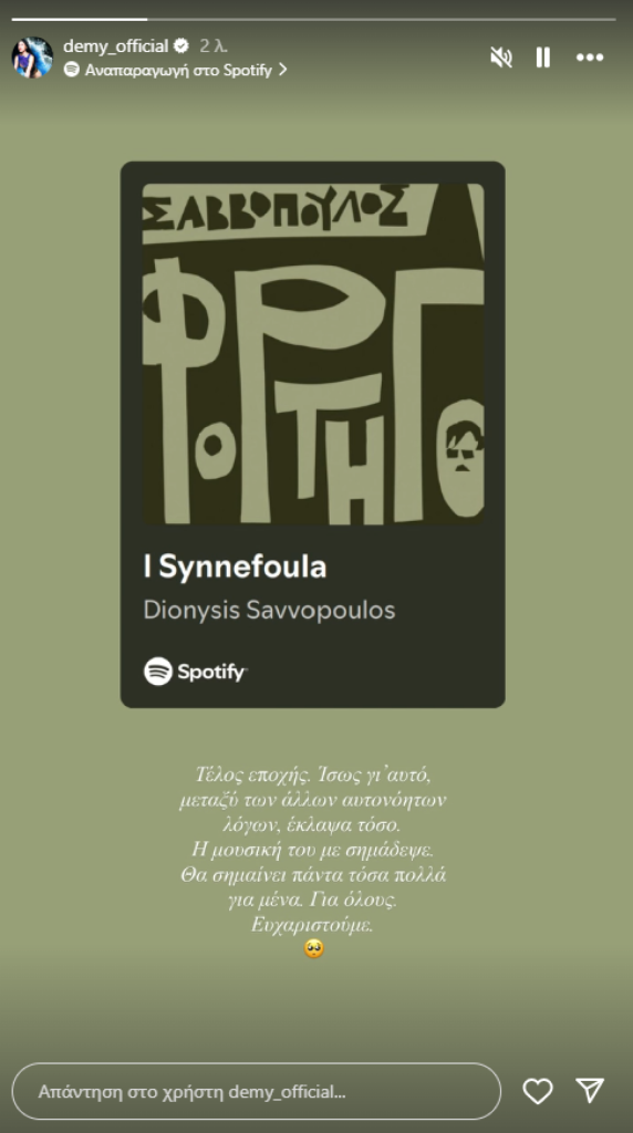 Και η Demy έκανε μια ανάρτηση – φόρο τιμής στον τραγουδοποιό, εκφράζοντας πόσο την επηρέασε ο θάνατός του.