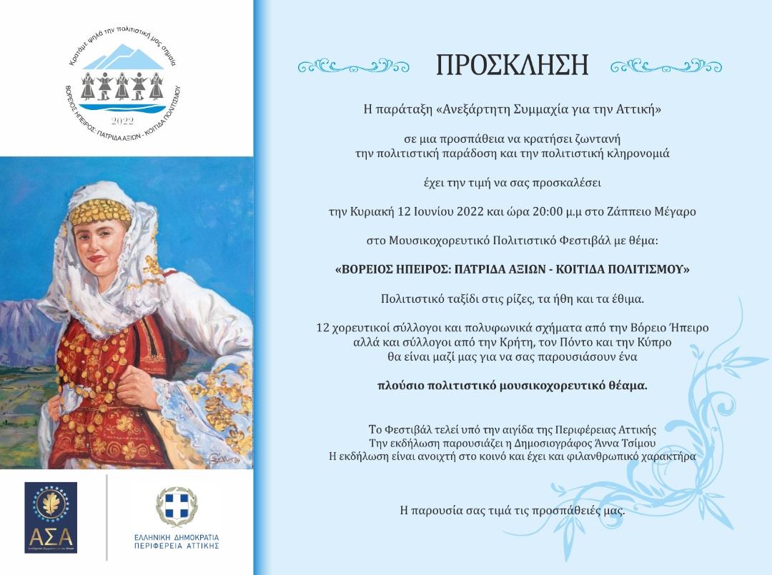Με στόχο τη διατήρηση και διάδοση των πολιτιστικών μας παραδόσεων, την Κυριακή 12 Ιουνίου 2022 και ώρα 20:00, στο Ζάππειο Μέγαρο, θα πραγματοποιηθεί το μεγάλο Μουσικοχορευτικό Πολιτιστικό Φεστιβάλ με θέμα «Βόρειος Ήπειρος: Πατρίδα αξιών – Κοιτίδα πολιτισμών», Πολιτιστικό ταξίδι στις ρίζες, τα ήθη και τα έθιμα.