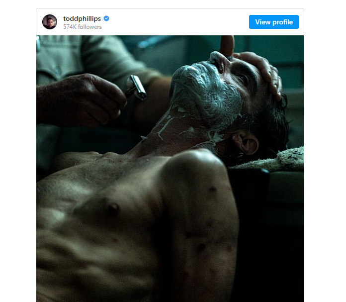 O σκηνοθέτης ανέβασε μία νέα φωτογραφία στο Instagram με τον ταλαιπωρημένο Arthur Fleck να ξυρίζεται από έναν κουρέα στο Arkham Asylum με τη λεζάντα «Το αγόρι μας».