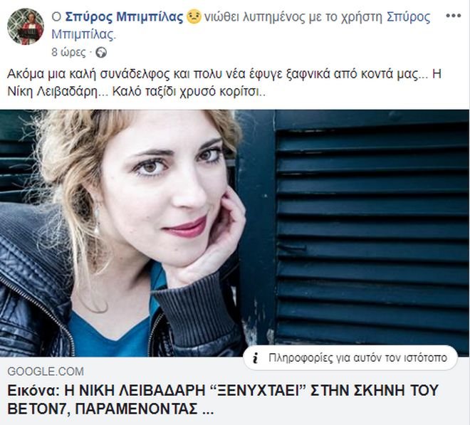 Την είδηση έκανε γνωστή με ανάρτησή του ο ηθοποιός Σπύρος Μπιμπίλας, γράφοντας, ακόμα μία καλή συνάδελφος έφυγε από κοντά μας.