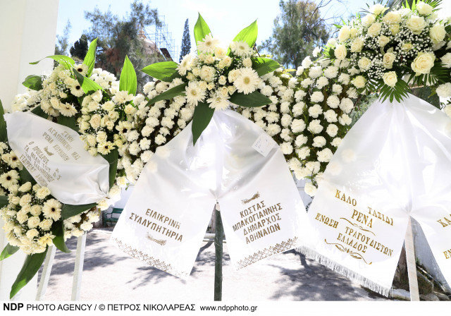 Ο χώρος πλάι στην εκκλησία των Αγ. Θεοδώρων έχει πλημμυρίσει από στεφάνια, ενώ πλήθος κόσμου και καλλιτέχνες καταφθάνουν για το τελευταίο αντίο στη Ρένα Κουμιώτη.