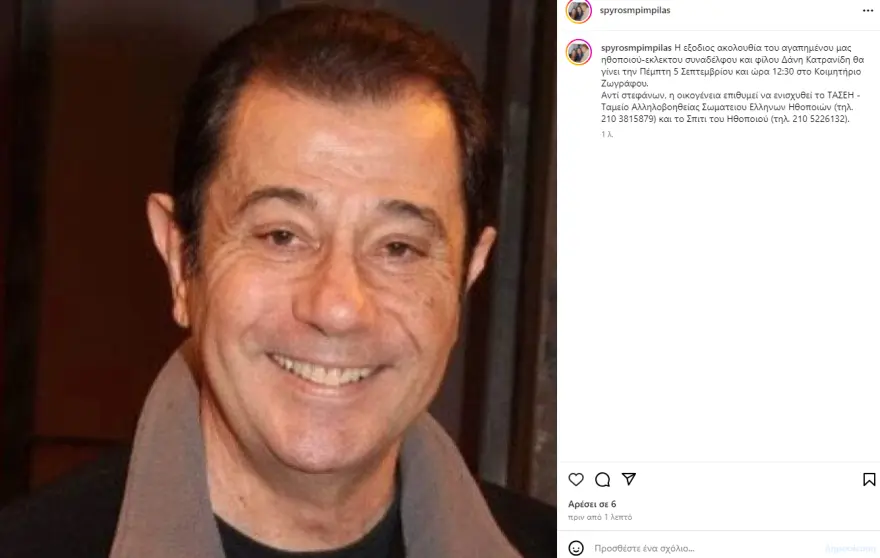 Ο ηθοποιός «έφυγε» από τη ζωή σε ηλικία 75 ετών, μετά από προβλήματα υγείας που αντιμετώπιζε τα τελευταία χρόνια. Στην ανάρτησή του, ο Σπύρος Μπιμπίλας έδωσε λεπτομέρειες για το πού και το πότε θα πουν το τελευταίο «αντίο» συγγενείς και φίλοι στον ηθοποιό, αλλά και για την επιθυμία της οικογένειάς του.
