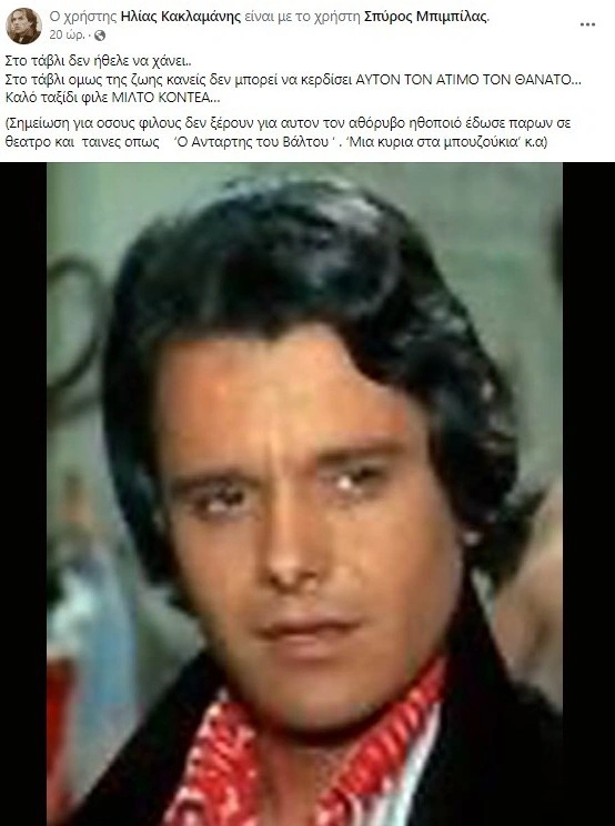 «Στο τάβλι δεν ήθελε να χάνει.. Στο τάβλι, όμως, της ζωής κανείς δεν μπορεί να κερδίσει αυτόν τον άτιμο τον θάνατο… Καλό ταξίδι, φίλε Μίλτο Κοντέα. (Σημείωση για όσους φίλους δεν ξέρουν για αυτόν τον αθόρυβο ηθοποιό, έδωσε το “παρών” σε θέατρο και ταινίες, όπως “Ο Αντάρτης του Βάλτου”, “Μια κυρία στα μπουζούκια” κ.α)», ανέφερε η ανάρτηση του Ηλία Κακλαμάνη.