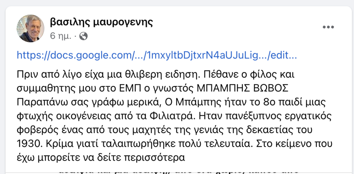 Ο Μπάμπης Βωβός, που γεννήθηκε το 1933 στα Φιλιατρά και κατάφερε να γράψει τη δική του ιστορία στις κατασκευές, πέθανε, όπως έγινε γνωστό, το περασμένο Σάββατο (13.7.2024).
