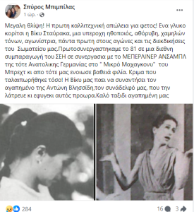 «Έφυγε» από τη ζωή η ηθοποιός Βίκυ Σταύρακα, όπως έκανε γνωστό με ανάρτησή του στον προσωπικό του λογαριασμό στο Facebook, ο Σπύρος Μπιμπίλας.