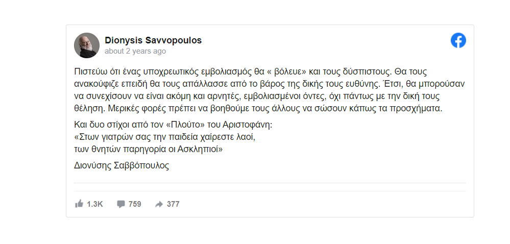 Σημειώνεται ότι ο Διονύσης Σαββόπουλος ζητούσε επιμόνως την υποχρεωτικότητα στον εμβολιασμό κατά Covid-19.