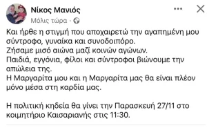Η ανάρτηση του συζύγου της Νίκου Μανιού: