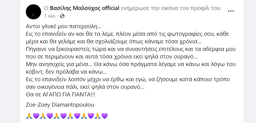 Την είδηση του θανάτου του ηθοποιού έκανε η κόρη του με ανάρτηση στην επίσημη σελίδα του Βασίλη Μαλούχου στο Facebook.