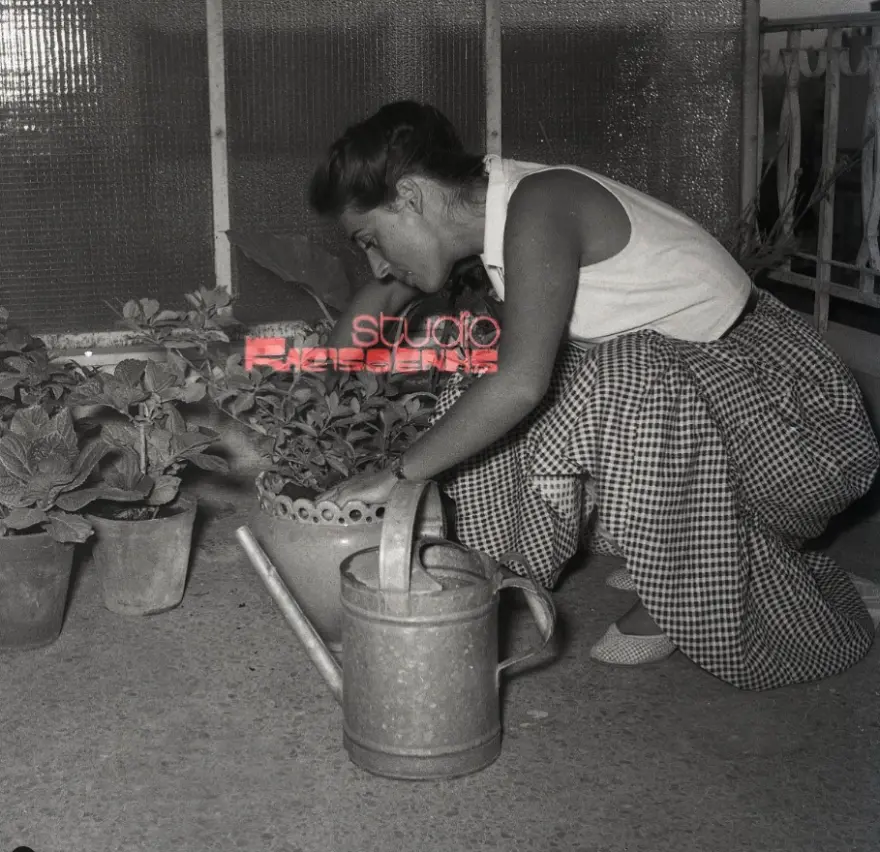 Στο ασπρόμαυρο στιγμιότυπο, η ηθοποιός βρίσκεται στον κήπο του σπιτιού της και ποτίζει τα λουλούδια.