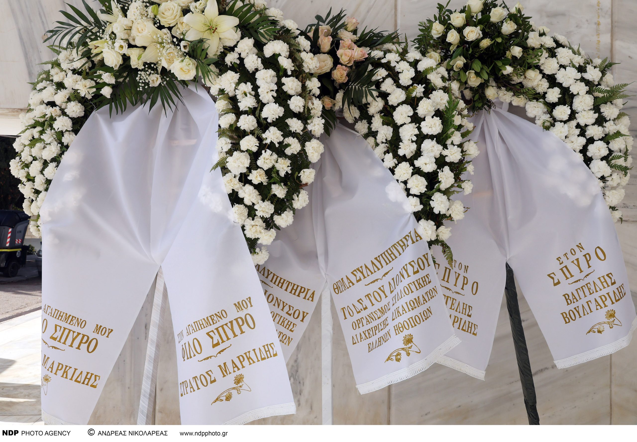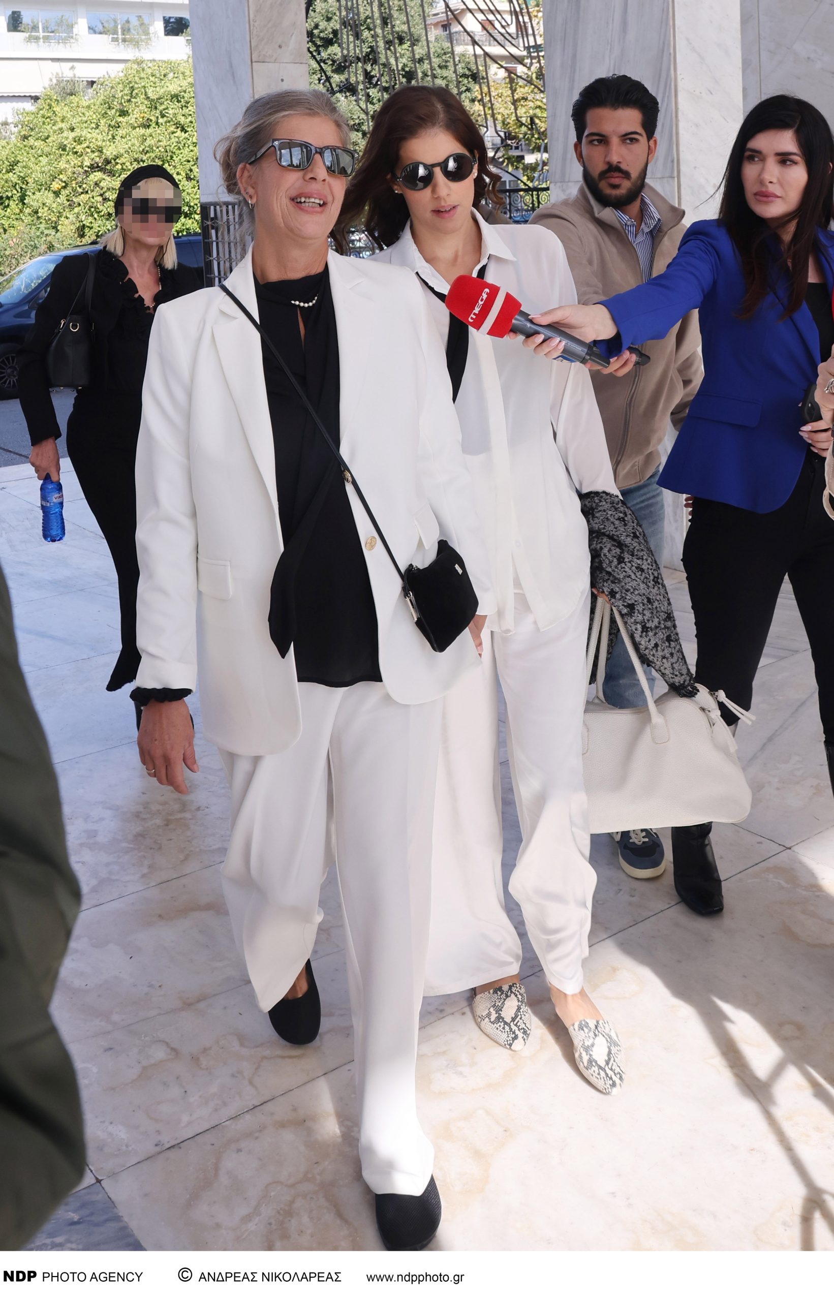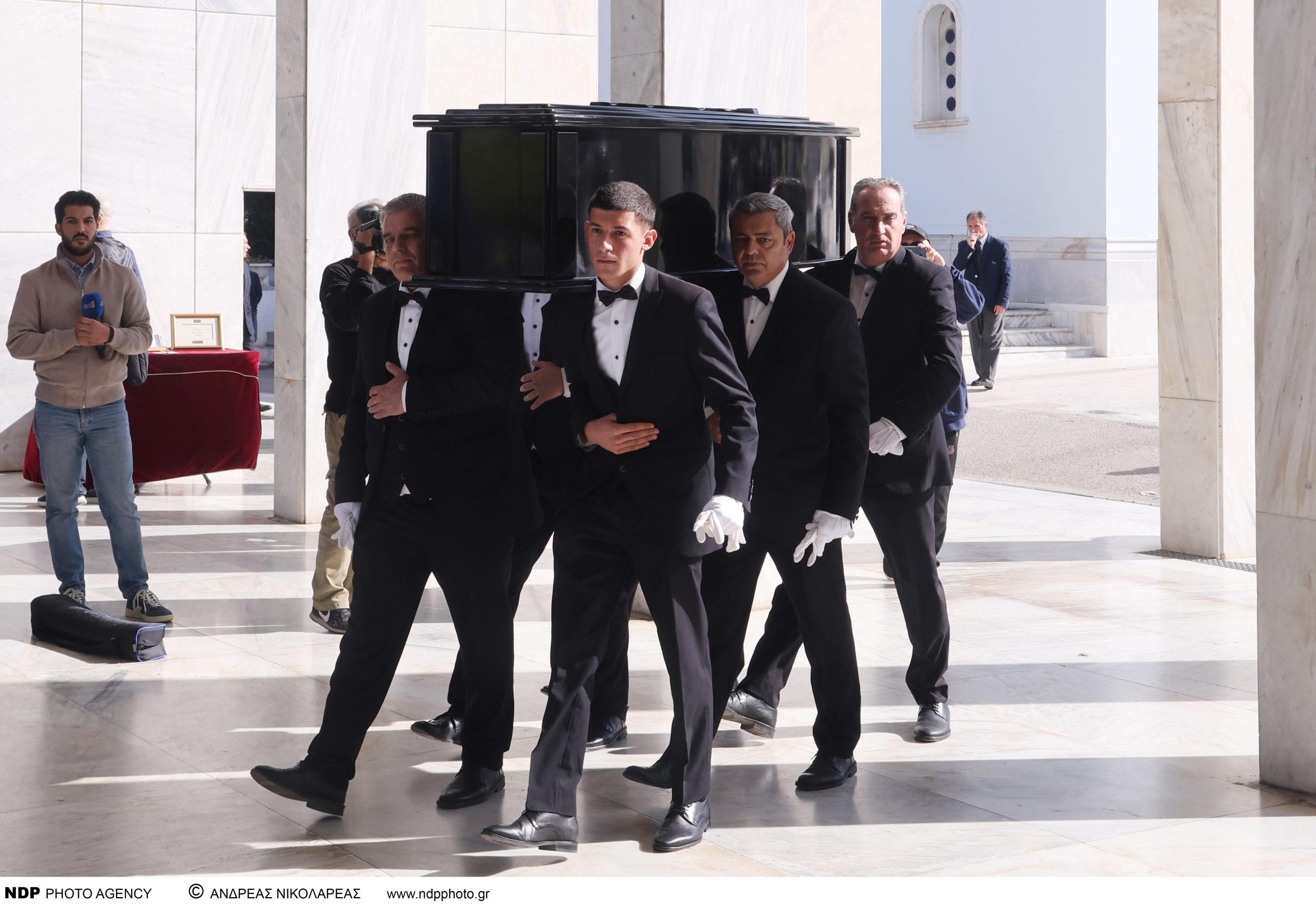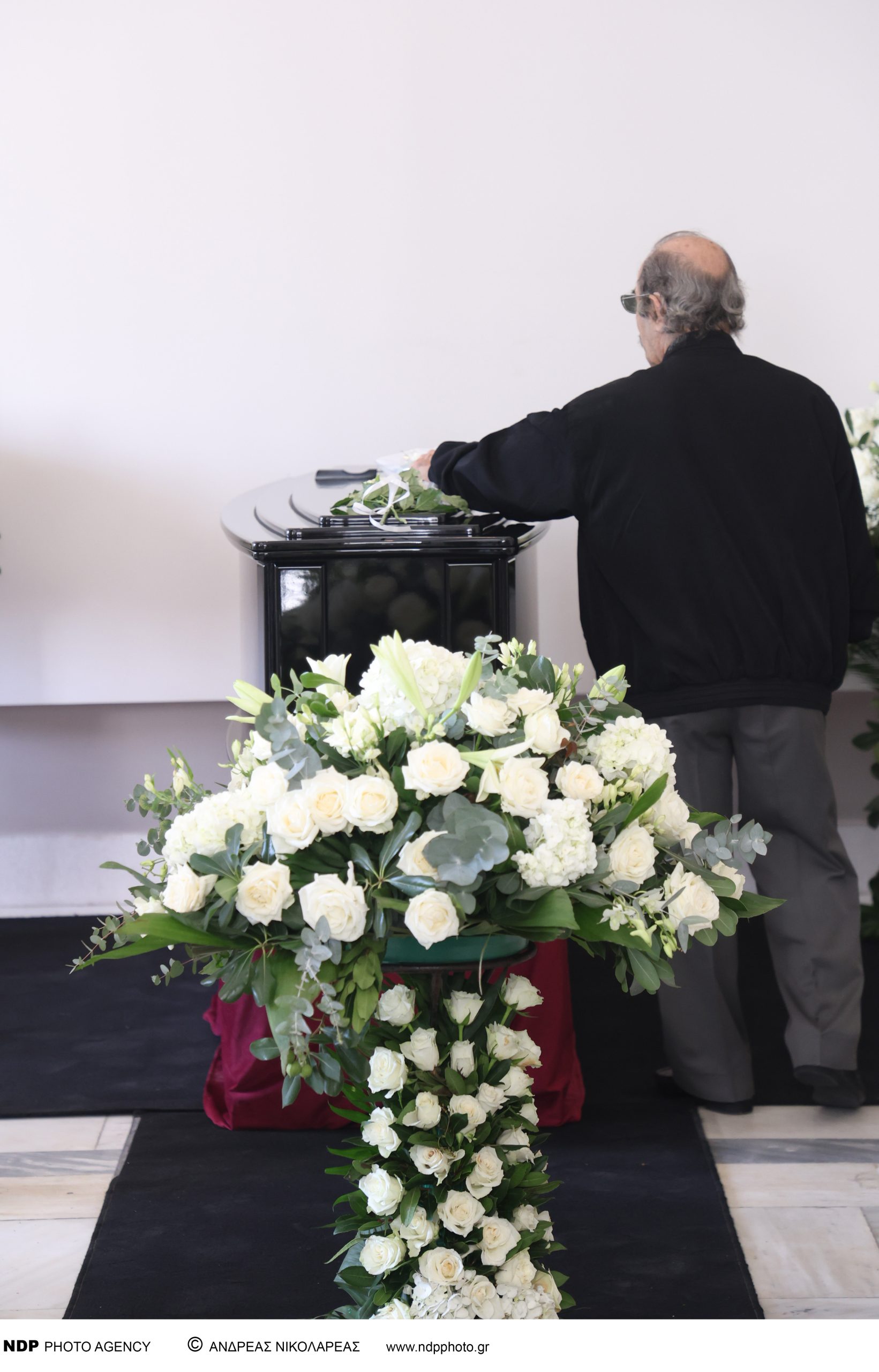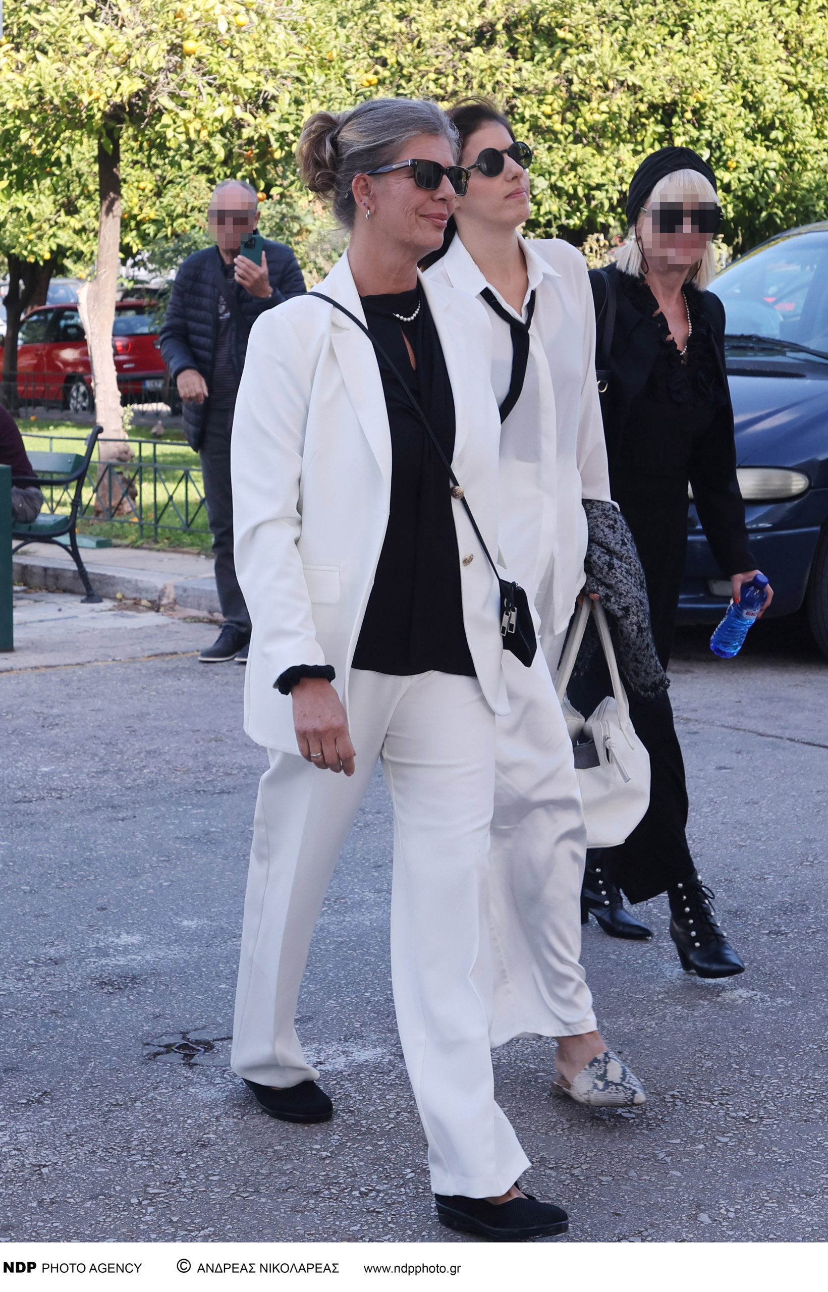 Πρώτες στην κηδεία του ηθοποιού έφτασαν η σύζυγός του Λίλιαν και η θετή κόρη του, Κωνσταντίνα, ντυμένες με λευκά σακάκια.